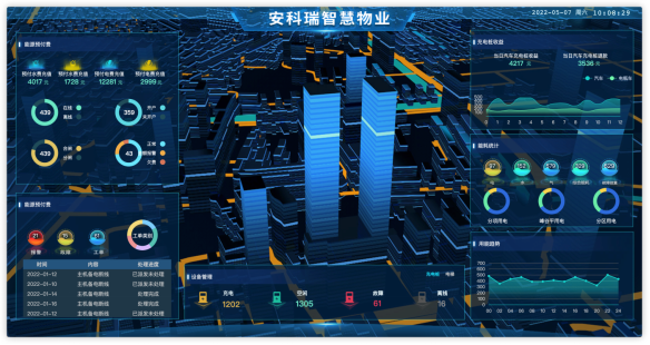 例如下圖所示的智慧物業駕駛艙,內容有:預付費、充電樁、電梯、空調、照明等設備管理、能耗統計、收益統計、運維情況等。其中百度地圖可以選配成