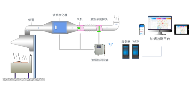 ■ 凈化器和風(fēng)機(jī)配合對(duì)油煙進(jìn)行凈化處理,同時(shí)對(duì)凈化設(shè)備的電流、電壓進(jìn)行監(jiān)測(cè)