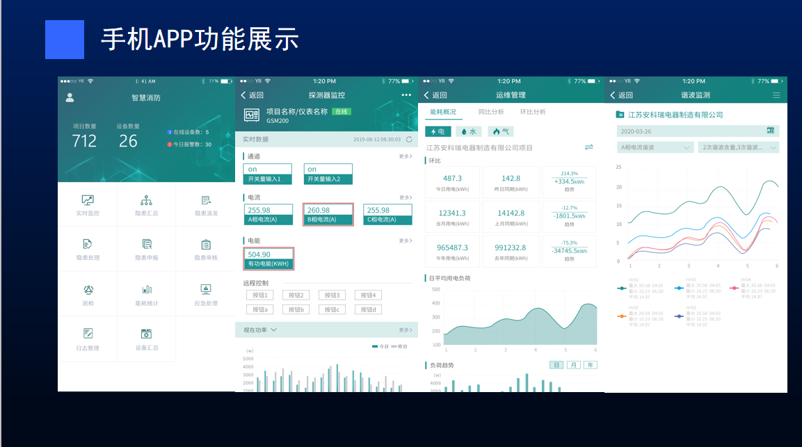 手機(jī)APP軟件具有IOS版本和安卓版本,并與電腦終端系統(tǒng)的數(shù)據(jù)同步,能展示剩余電流、溫度、電壓、電流等電氣安全參數(shù)的實(shí)時(shí)監(jiān)測(cè)數(shù)據(jù)及變化曲線、歷史數(shù)據(jù)與變化曲線;短路、斷線、漏電、超溫、過(guò)壓、欠壓、過(guò)流等電氣故障實(shí)時(shí)報(bào)警數(shù)據(jù)等;能實(shí)時(shí)顯示項(xiàng)目地理位置、未排除隱患數(shù)、未處理巡檢數(shù)等;通過(guò)APP消息推送的方式提醒用戶實(shí)時(shí)報(bào)警信息;可以實(shí)現(xiàn)遠(yuǎn)程復(fù)位、遠(yuǎn)程分閘功能;可以對(duì)所有現(xiàn)場(chǎng)探測(cè)器進(jìn)行遠(yuǎn)程參數(shù)設(shè)定及修改;可以對(duì)所有現(xiàn)場(chǎng)探測(cè)器的遠(yuǎn)程控制記錄進(jìn)行查詢;