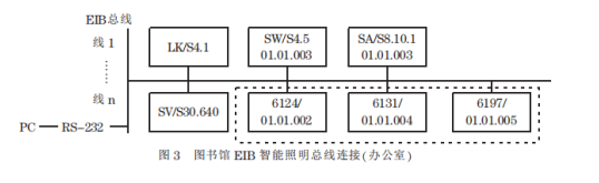 在此以辦公室為例,應用系統(tǒng)控制軟件 ETS3,選擇相關設備進行總線連接。元件包括 LK/S4.1 線路耦合器,SV/S30.640 電源供應器,SW/S4.5 定時控制器,6124 四鍵帶顯示智能控制面板,6131 移動探測器,6197 調光控制器,SA/S8.10.1 開關驅動器,通過配置物理地址,進行總線連接。如圖 3 所示:
