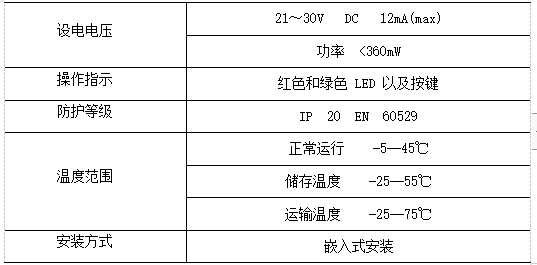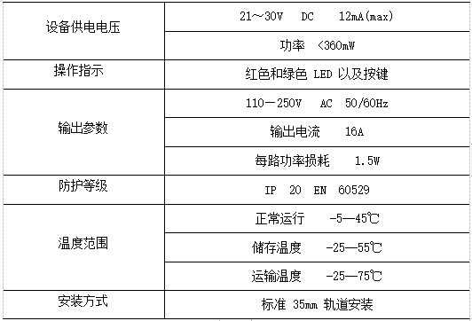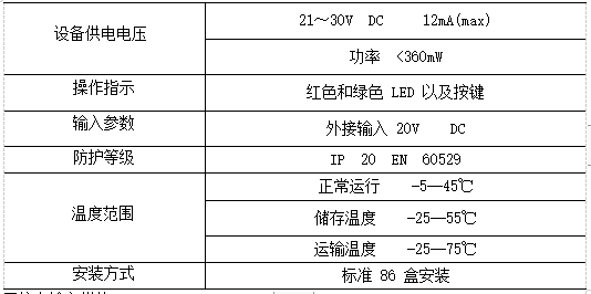 用于接受外部干接點信號輸入,可通過不同參數(shù)配置實現(xiàn)開關、調光、場景、窗簾控制、調溫、報警等功能,電氣參數(shù)如下: