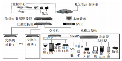 微模塊數(shù)據(jù)中心的機(jī)房管理采用 NetEco 基礎(chǔ)設(shè)施管理系統(tǒng),此系統(tǒng)由管理軟件和其他部件構(gòu)成,實(shí)現(xiàn)了對數(shù)據(jù)中心的溫濕度、空調(diào)系統(tǒng)、供配電系 統(tǒng)、UPS 后備電源、消防及監(jiān)控等多系統(tǒng)的數(shù)據(jù)采集與監(jiān)控,將各子系統(tǒng)和分散環(huán)節(jié)集中統(tǒng)一管理,為智 能化微模塊數(shù)據(jù)中心的全系統(tǒng)監(jiān)控提供了可靠保 障。NetEco 管理系統(tǒng)架構(gòu)圖如圖 3 所示。