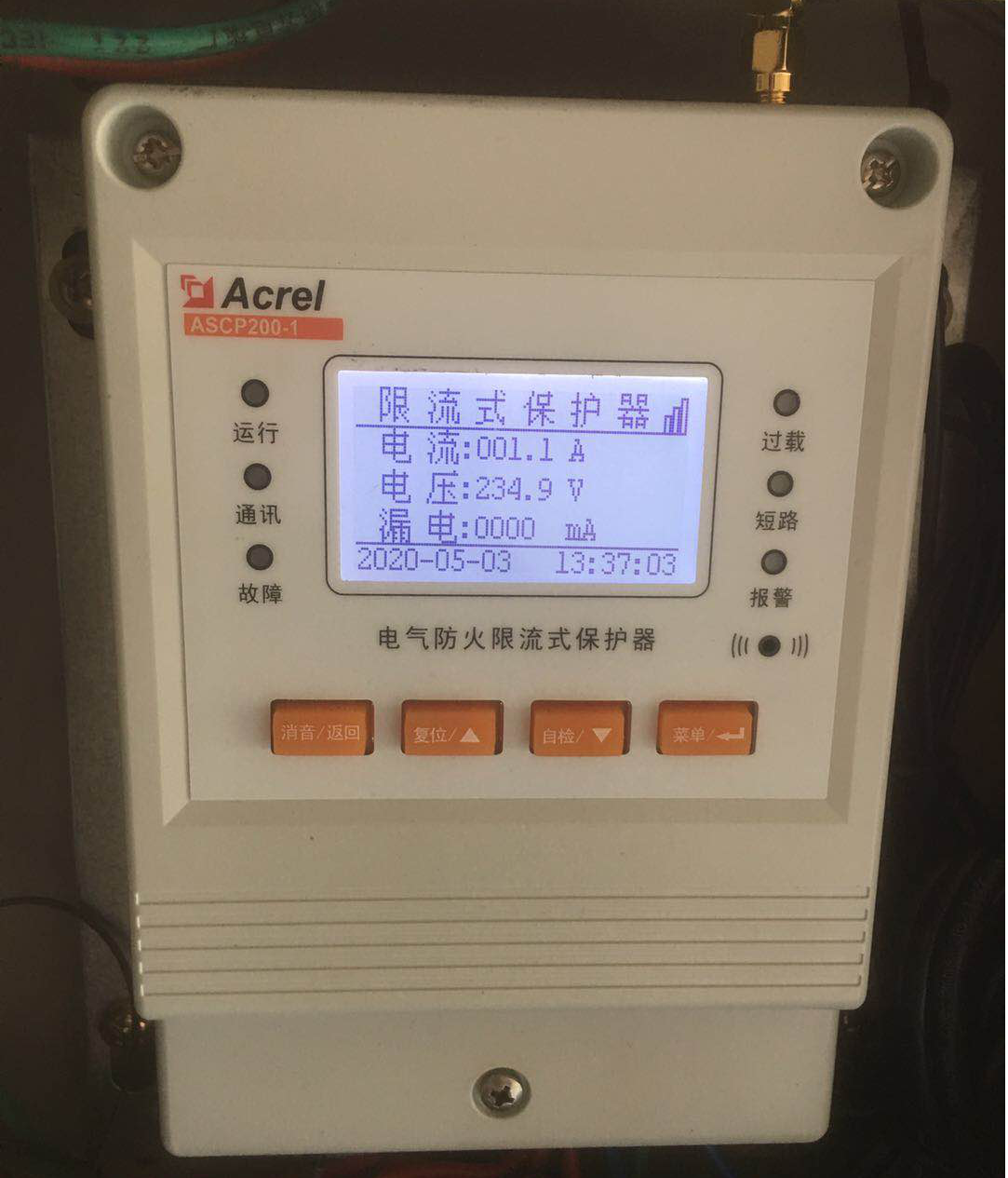 本次使用的是ASCP200-1型電氣防火限流式保護器,保護器是單相限流式保護器,額定電流為63A。可廣泛應用于學校、醫院、商場、賓館、娛樂場所、寺廟、文物建筑、會展、住宅、倉庫、幼兒園、老年人建筑、集體宿舍、電動車充電站及租賃式商場商鋪、批發市場、集貿市場、甲乙丙類危險品庫房等各種用電場所末端干、支路的線路保護。本項目安裝于住宅的進戶開關處,能夠保障住宅末端用電安全。