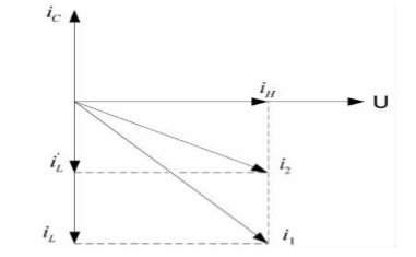 根據(jù)電路原理,電流在電感元件中作功時,電流滯后于電壓90o。而電流在電容元件中作功時,電壓滯后于電流90o。在同一電路中,電感電流與電容電流方向相反,互差180o,兩者的電流相互抵消,使電流的矢量與電壓矢量之間的夾角縮小。感性負(fù)荷的有功電流IH與電壓U同相位,假設(shè)電感和電容的合成電流為I1,無功功率為Q1,功率因數(shù)cosφ1,各相量的相位關(guān)系如下圖。