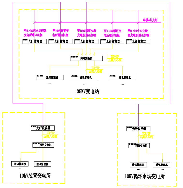 本工程為山東凱瑞英材料科技有限公司羥脲磺胺類醫(yī)藥中間體產(chǎn)業(yè)鏈項(xiàng)目,本工程系統(tǒng)包含3個(gè)變電站(所)分別為35/10kV變電站、10kV裝置變電所和10kV循環(huán)水廠變電所。三個(gè)變電所均配置有后臺(tái)監(jiān)控系統(tǒng),35/10kV變電站中放置三套后臺(tái)電腦,兩個(gè)10kV變電所各配置一套后臺(tái)系統(tǒng)。除10kV部分保護(hù)數(shù)據(jù)外,變電所下的0.4kV進(jìn)線保護(hù)和母聯(lián)保護(hù),馬達(dá)保護(hù)裝置數(shù)據(jù)均上傳接入10kV變電所后臺(tái)系統(tǒng)。最終兩個(gè)10kV變電所數(shù)據(jù)通過光纖上傳到35/10kV變電站后臺(tái),進(jìn)行集中監(jiān)控。35/10kV變電站集控系統(tǒng)同時(shí)預(yù)留了中心化驗(yàn)室變電所,辦公樓變電所,污水處理站變電所,罐區(qū)變電所的數(shù)據(jù)接口。集控系統(tǒng)要求配備了智能設(shè)備接口,充分保證系統(tǒng)的安全可靠運(yùn)行,也要求兼顧目前綜合自動(dòng)化系統(tǒng)的全面性、先進(jìn)性。