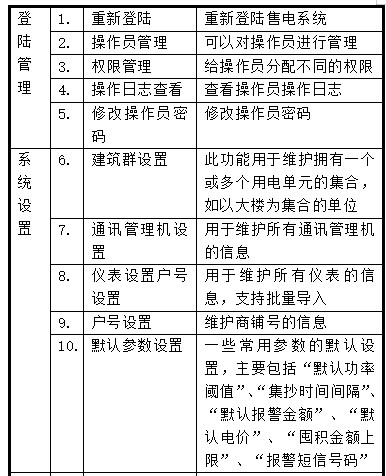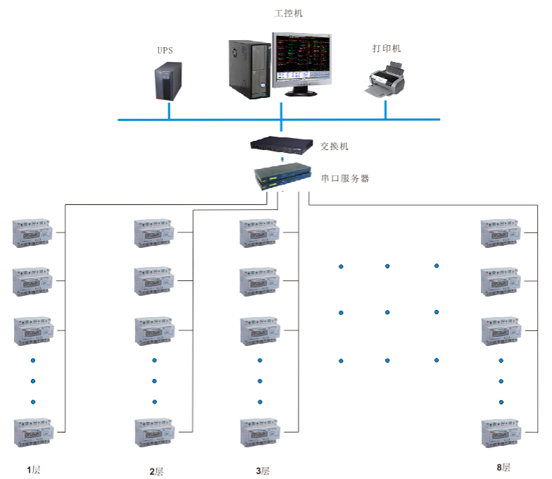 現場設備層主要為:遠程預付費電度表。這些裝置分別對應相應的一次設備安裝在電氣柜內,這些裝置均采用RS485通訊接口,通過現場MODBUS總線組網通訊,實現數據現場采集。 網絡通訊層主要為:通訊服務器,其主要功能為把分散在現場采集裝置集中采集,同時傳至站控層,完成現場層和站控層之間的數據交互。 站控管理層:設有高性能工業服務器、顯示器、UPS電源、打印機等設備。監控系統安裝在服務器上,集中采集顯示現場設備運行狀況,以人機交互的形式顯示給用戶。 智能儀表現場連接示意 現場智能裝置(遠程預付費電度表)以手拉手方式通過屏蔽雙絞線(RVVSP2*1.0)進行通訊連接,每根總線連接智能儀表數量在32只以內,不同種類的智能裝置連接在不同的總線上,然后將數據上傳至采集器,進而將數據上傳至監控主機。具體連接示意圖如下所示: 3 系統功能 整個系統軟件設計分為三個大塊,分別是集中抄表服務系統,遠程預付費電能管理系統,以及用戶查詢系統。 集中抄表服務程序常年運行,不間斷定時對所有表進行遠程抄表;遠程預付費系統包含所有開戶、售電、遙控及報表功能;用戶查詢機系統用于用戶查詢個人信息、充值和用電情況;另外還可配置手機端查詢網站,可用于用戶在手機網站終端上實時查詢個人信息、充值、遠程控制及每日用電情況,如果條件滿足,還支持用戶使用支付寶銀聯等方式遠程自助購電。 主要特點如下: u 快速配置,即裝即用:將電表和通訊管理機配置導入系統就可以使用; u 遠程集中抄表:免去人工抄表,電表狀態實時性最高可精確到3分鐘以內; u 支持單獨計價、多費率、階梯電價:可對每塊電表單獨設置電價、費率和階梯電價; u 遠程售電:財務集中管理,電量實時下發,并比對充值次數防止作弊; u 數據安全:網絡數據傳輸采用金融級的3DES加密算法,防止數據作弊竊電; 手機短信提醒:當金額不足或金額欠費,共三級u 預警,都可及時短信通知商戶; u 遠程控制:可對任意一塊電表執行遠程拉閘或保電等一系列遠程控制操作,方便管理; u 能耗分析及查詢:用戶和管理員都可查詢預付費表或各類接入的計量儀表每天的用能狀況; u 個人手機查詢網站:支持手機端用戶自主購電,自主查詢。 傳統的IC卡預付費售電管理系統實現了先交費后用電的管理模式,但由于抄收電表數據依賴于購電卡,用戶用電數據滯后于發生時間,不僅需要人工抄表,也無法有效進行用電管理、監控和實時控制。 利用遠程預付費電能管理系統,無需IC卡,可以實現計算機遠程集中抄表、實時監控、遠程充值和遠程控制,再通過預警信息和短信通知,以及手機網站,物管部門即可完成整個抄表、收費、控制和核查工作,實現高度信息化和自動化,大大提高用電營銷管理效率和水平,節約人力物力的同時,也提高了經濟效益,同時還具有防信息泄露防竊電的安全功能。 ①集中抄表服務系統 集中抄表服務程序包含三大模塊,除了常年運行的定時對所有儀表進行集中遠程抄表以外,還集成了報警短信發送服務,能將電費金額預警和欠費預警自動生成手機短信自發送給對應的用戶,該功能需要與硬件短信貓配合使用。系統默認半小時對所有表進行一次遠程集中抄表,時間間隔支持個性化配置。 ②遠程預付費電能管理系統 本系統分為五大模塊,分別是操作員登陸模塊、系統配置模塊、用戶(商鋪)管理模塊、售電管理模塊、報表中心模塊,系統大致運行和操作流程如下: 本系統所有的報表及記錄查詢,都支持excel格式導出的功能。 1.登陸管理:管理操作員賬戶及權限分配,查看系統日志等功能; 2.系統設置:對建筑、通訊管理機、儀表及默認參數進行配置; 3.用戶管理:對商鋪用戶執行開戶、銷戶、遠程分合閘、抄表導出及記錄查詢等操作; 4.售電管理:對已開戶的表進行遠程售電、退電、沖正及記錄查詢等操作; 5.報表中心:提供售電財務報表、用能報表、報警報表等查詢。