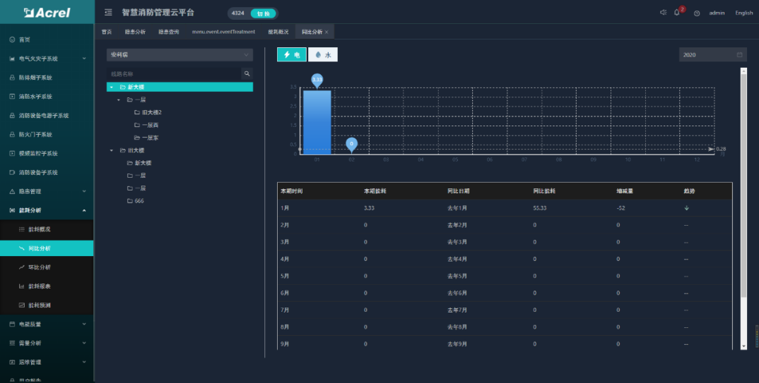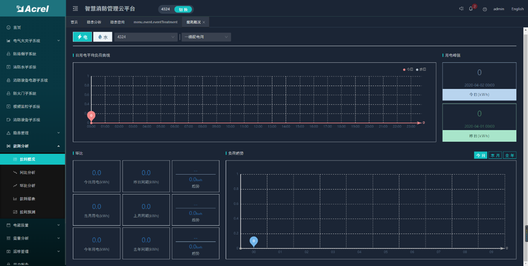 能耗分析功能包括了能耗概況、能耗同比、能耗環比、能耗報表和能耗預測等五個模塊??梢圆榭吹卿浻脩粝碌乃许椖康哪芎慕y計、同環比和報表,且按日、周、月等維度進行能耗預測分析。