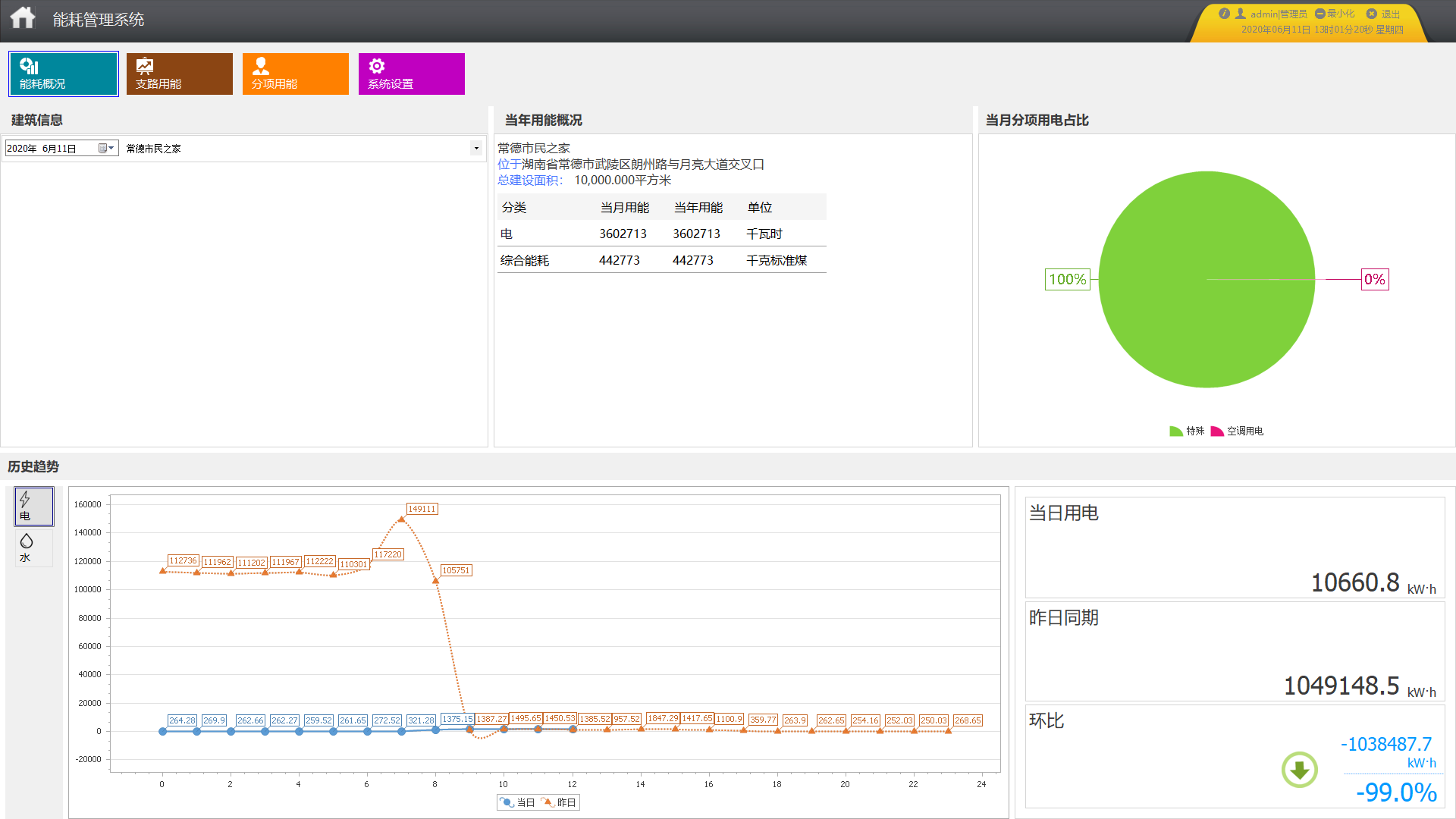 主頁面顯示該建筑的建筑圖片,建筑基本信息,建筑當(dāng)月分項(xiàng)用電餅圖和各種能源的消耗量。根據(jù)所選的建筑,對(duì)其建筑圖片進(jìn)行加載,可以選擇時(shí)間查看建筑能耗情況,選擇建筑或時(shí)間后自動(dòng)刷新,默認(rèn)為當(dāng)天。
