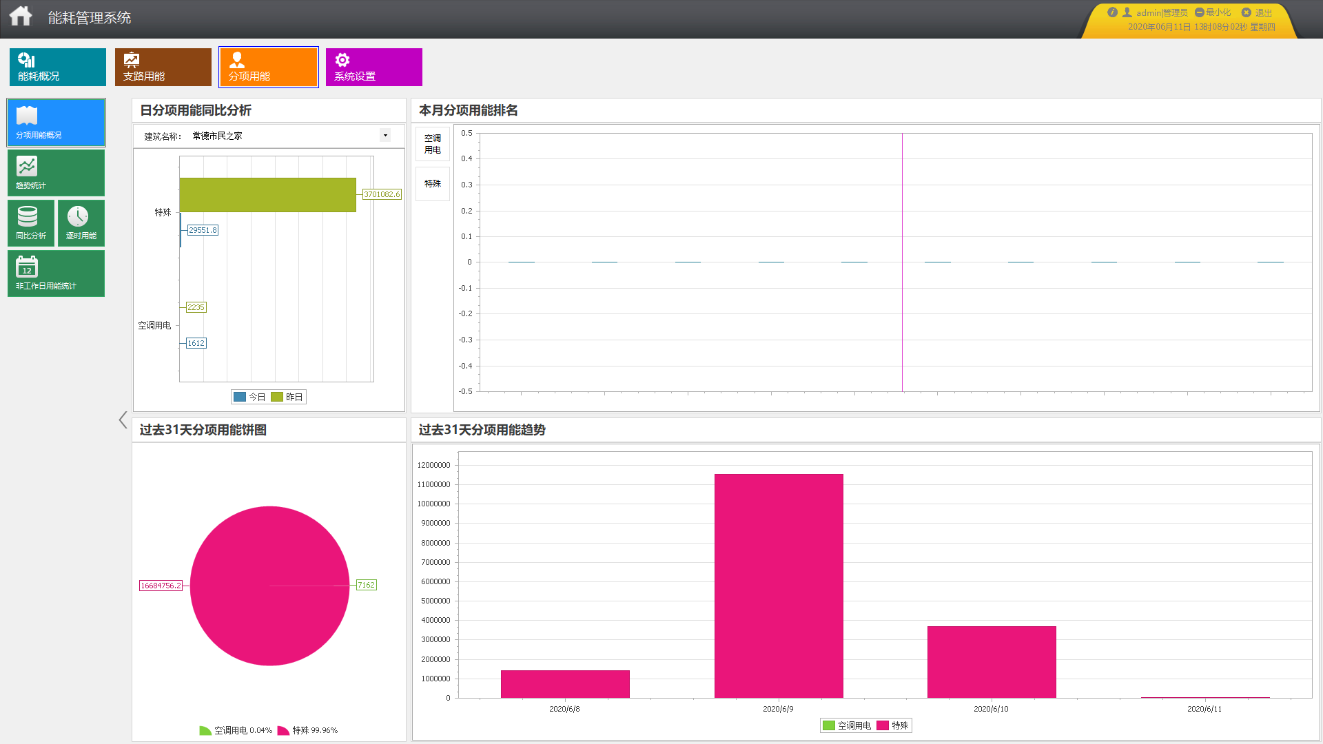 系統(tǒng)可以按照分項(xiàng)進(jìn)行能耗統(tǒng)計(jì)與顯示。其中,日分項(xiàng)用能同比分析圖顯示不同分項(xiàng)的當(dāng)日與昨日能耗柱狀圖(藍(lán)色柱表示今日,綠色柱表示昨日);用能餅圖顯示各分項(xiàng)過去31天的用能占比;堆積圖顯示各分項(xiàng)過去31天的能耗趨勢;分項(xiàng)用能排名圖顯示被選中分項(xiàng)對(duì)應(yīng)能耗值排名前10位的支路。