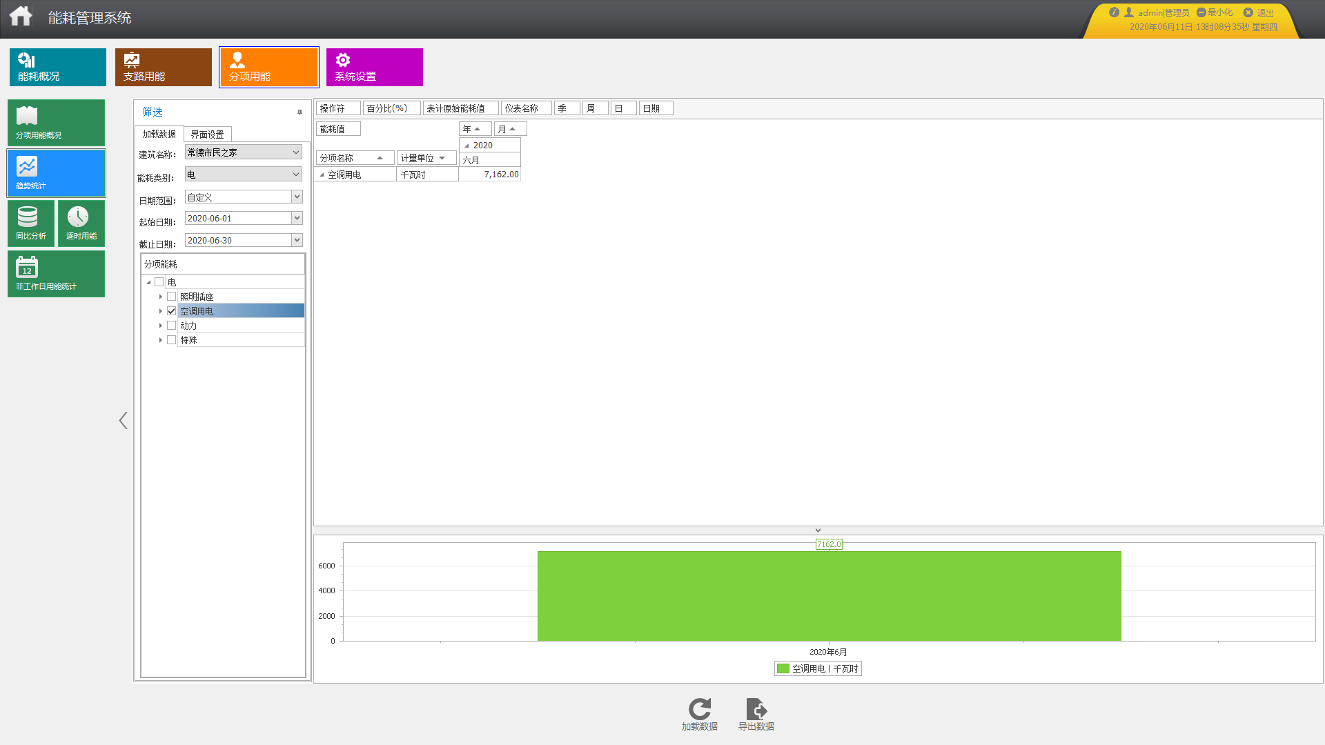 系統(tǒng)可以統(tǒng)計(jì)各分項(xiàng)某段時(shí)間內(nèi)逐日、逐周、逐月、逐季、逐年用能。可查看分項(xiàng)中各支路用能趨勢,可根據(jù)已有的日期或者自定義時(shí)間進(jìn)行查詢,統(tǒng)計(jì)數(shù)據(jù)可導(dǎo)出至Excel。