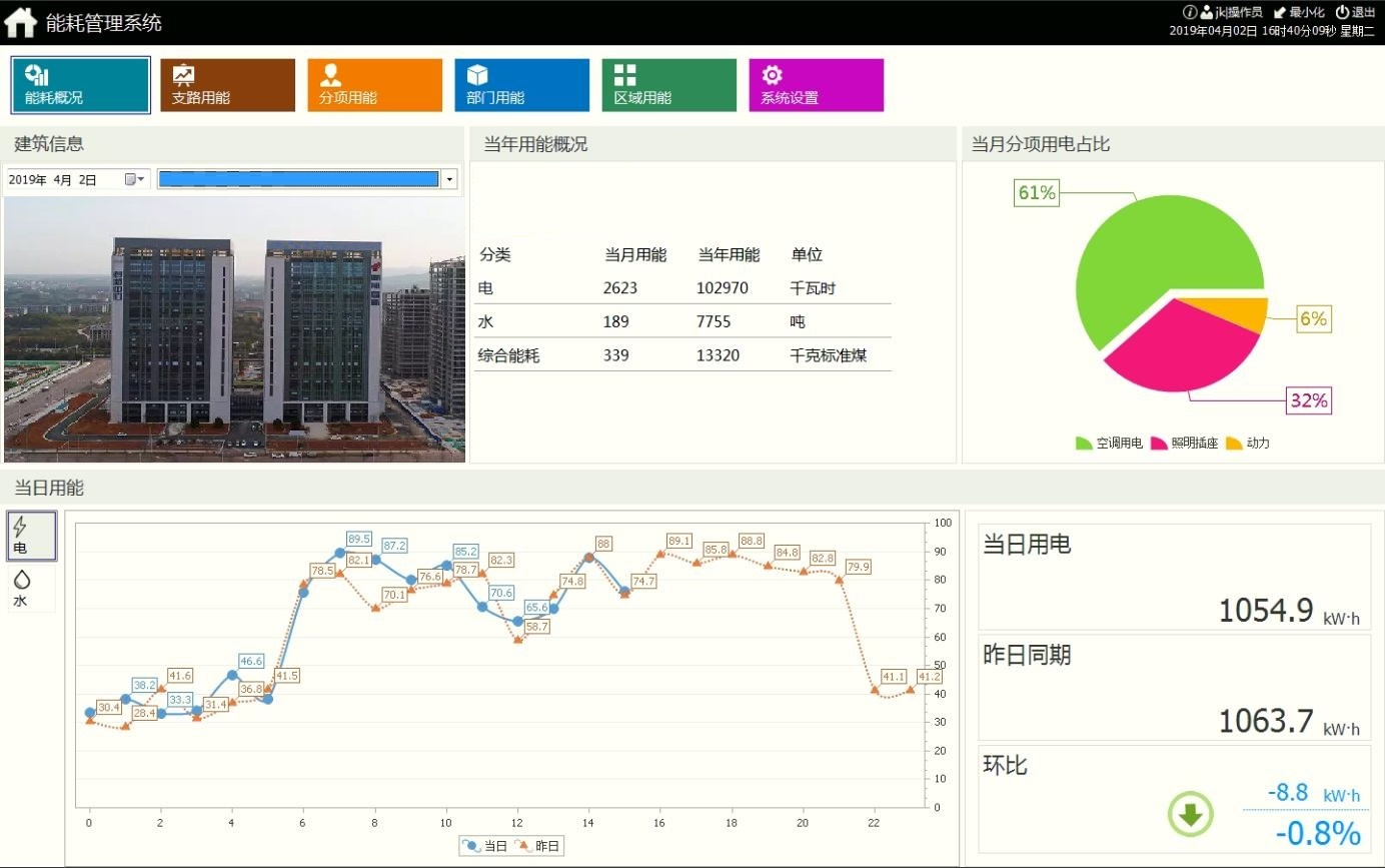 通過(guò)表計(jì)計(jì)量電能消耗,界面下方顯示電能的當(dāng)日逐時(shí)用能曲線;單擊每個(gè)分類(lèi)能耗的上部區(qū)域,可跳轉(zhuǎn)到該分類(lèi)能耗的用能分析主界面;