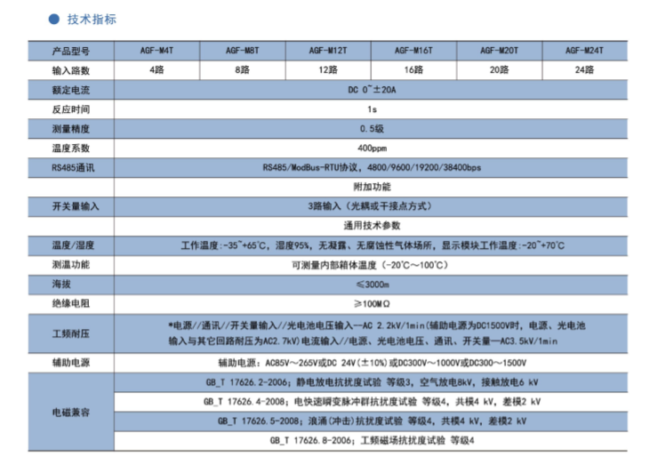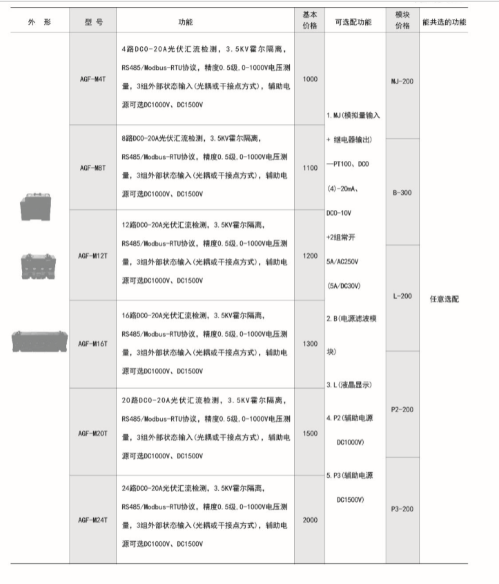 AGF-T穿孔式光伏匯流采集裝置是專門應(yīng)用于智能光伏匯流箱,用于監(jiān)測(cè)光電池陣列中電池板運(yùn)行狀態(tài),組串電流測(cè)量,匯流箱中防雷器狀態(tài)采集、直流斷路器狀態(tài)采集、裝置帶有RS485接口可以把測(cè)量和采集到的數(shù)據(jù)和設(shè)備狀態(tài)上傳。