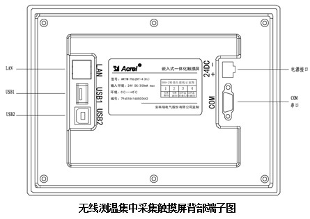 無線測溫集中采集觸摸屏:無線測溫觸摸屏可以嵌入式安裝在高壓柜、低壓抽屜柜內,每臺裝置可以接收240個傳感器的數據,可與ATE100、ATE200、ATE300三種傳感器選配使用。裝置帶有一路485接口、可選配一路以太網口,可將采集到的溫度數據上傳到監控中心。