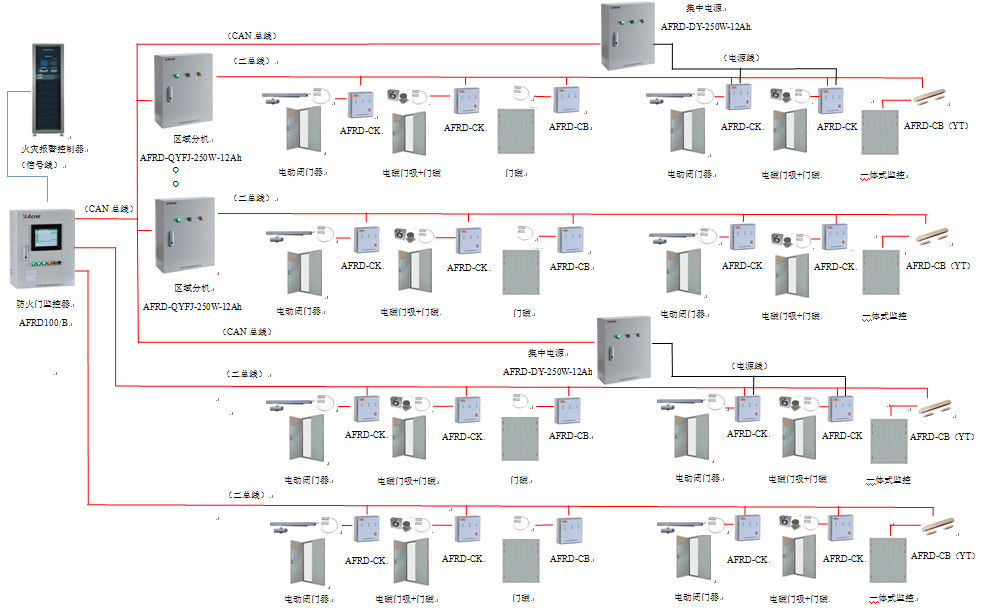 AFRD100防火門監(jiān)控系統(tǒng)采用AFPM100/B防火門監(jiān)控器(主機(jī))+區(qū)域分機(jī)+防火門監(jiān)控模塊三層結(jié)構(gòu)組網(wǎng)模式,適用范圍廣,滿足各種環(huán)境的現(xiàn)場,便于區(qū)域化管理,監(jiān)控模塊與監(jiān)控器之間采用二總線通訊,監(jiān)控器與分機(jī)之間采用CAN總線通訊,滿足了通訊實時性高的要求。