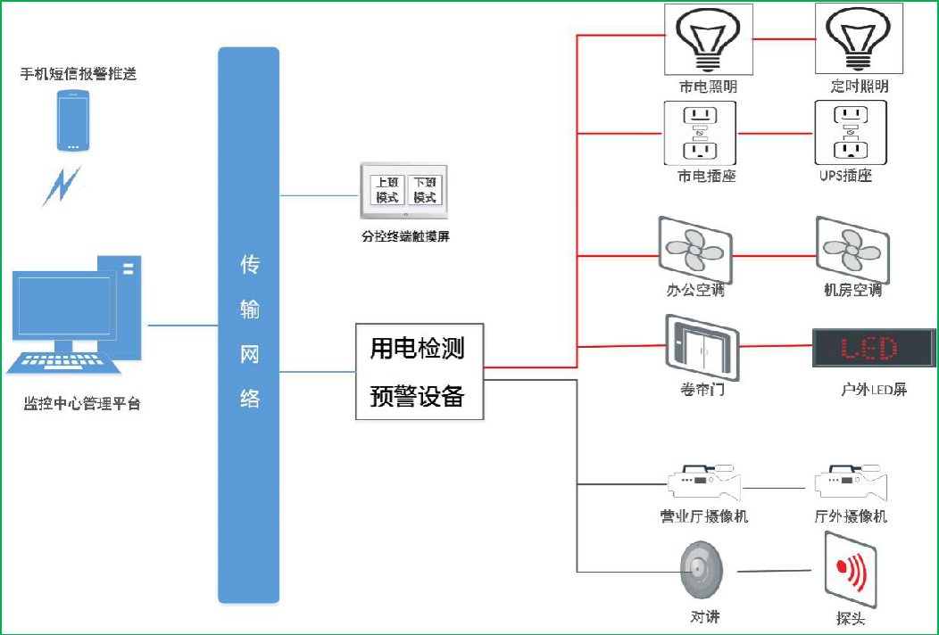 目前銀行營業(yè)場所(營業(yè)網(wǎng)點(diǎn)、自助銀行及辦公大樓等)的用電系統(tǒng)還處于無網(wǎng)絡(luò)化、無智能化的單機(jī)分散獨(dú)立運(yùn)行的狀態(tài),主要還是采取傳統(tǒng)的保護(hù)措施,以空開、保險絲、漏保、定時器等方式為主流,無法實(shí)現(xiàn)對前端強(qiáng)電系統(tǒng)進(jìn)行遠(yuǎn)程實(shí)時監(jiān)測和管理。
