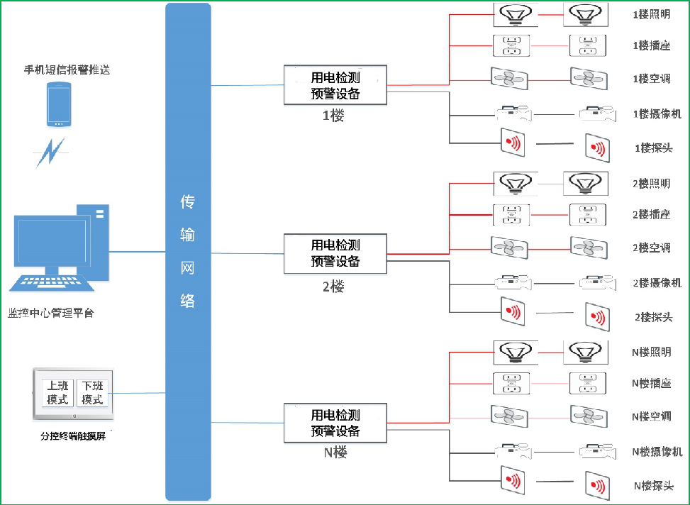 系統(tǒng)應(yīng)能夠?qū)﹄妷骸㈦娏鳌囟取㈦娀〉冗M(jìn)行實(shí)時監(jiān)測并進(jìn)行數(shù)據(jù)分析,對被保護(hù)線路的過壓、過載、過流、過溫、欠壓、打火、缺相、設(shè)備不在線等情況進(jìn)行預(yù)警,系統(tǒng)在發(fā)現(xiàn)電氣火災(zāi)預(yù)警時,信息可多種途徑及時通知相關(guān)單位處理,確保用電線路系統(tǒng)安全。系統(tǒng)應(yīng)具有獨(dú)立完整功能,通過系統(tǒng)平臺及前端系統(tǒng)設(shè)備實(shí)現(xiàn)對電氣火災(zāi)風(fēng)險的檢測預(yù)警及管理,系統(tǒng)應(yīng)預(yù)留與其他應(yīng)用系統(tǒng)、設(shè)備交互對接接口,確保系統(tǒng)擴(kuò)展性及融合性。