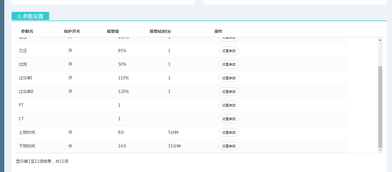 可以設(shè)置報警參數(shù)及對應(yīng)的保護(hù)開關(guān),對上下班時間和對應(yīng)的延時進(jìn)行設(shè)置