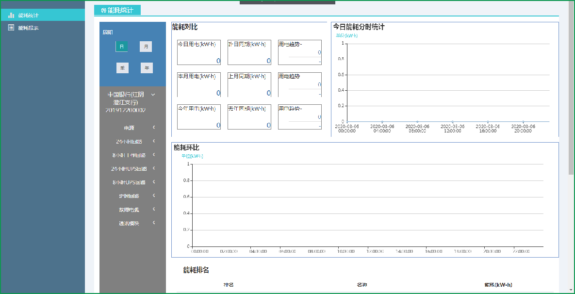 能耗頁面:針對各個網(wǎng)點(diǎn)或者場所,平臺能夠針對整個網(wǎng)點(diǎn)或者單個回路,按照年、季度、月、日或者小時,對能耗進(jìn)行查詢并統(tǒng)計,并對每個回路進(jìn)行能耗的排名。