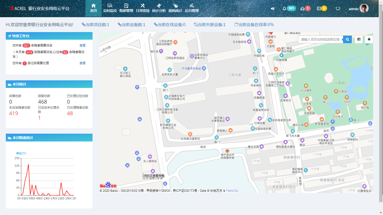 展示頁面:方便用戶在大屏幕上面展示所轄項目的概括,隱患的統(tǒng)計,分類等信息。循環(huán)展示今日產(chǎn)生的報警信息