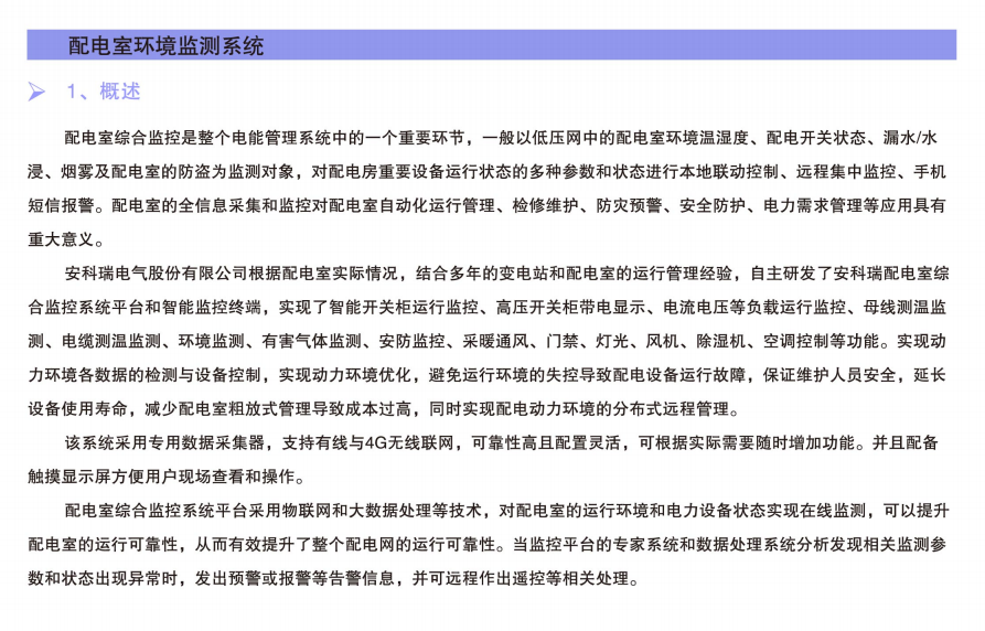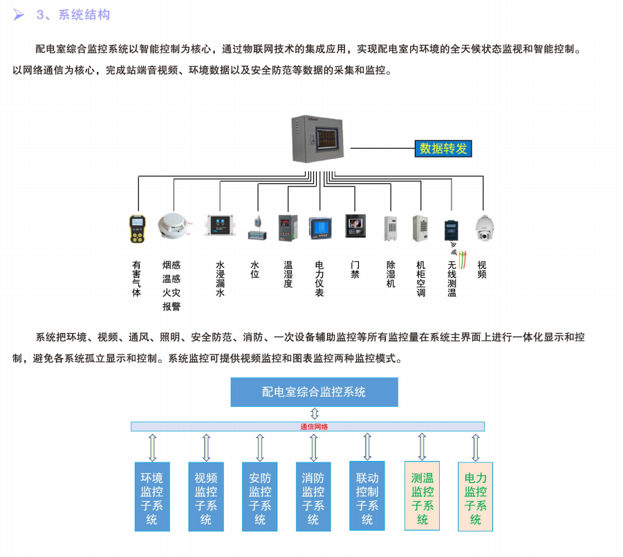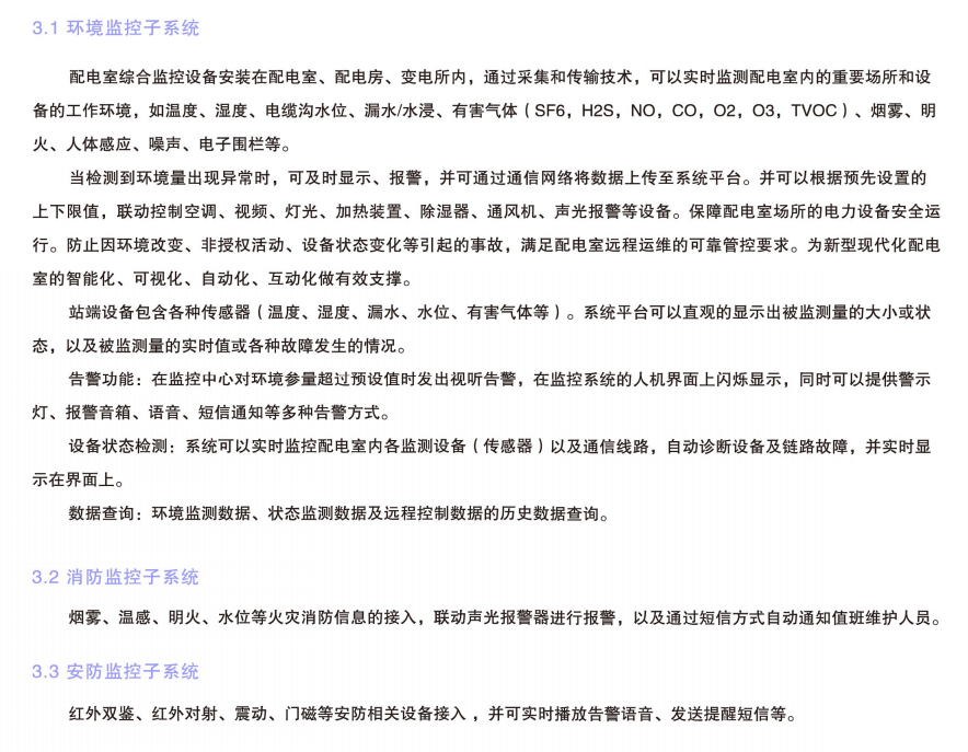 配電室綜合監(jiān)控是整個(gè)電能管理系統(tǒng)中的一個(gè)重要環(huán)節(jié),一般以低壓網(wǎng)中的配電室環(huán)境溫濕度、配電開關(guān)狀態(tài)、漏水/水浸、煙霧及配電室的防盜為監(jiān)測對(duì)象,對(duì)配電房重要設(shè)備運(yùn)行狀態(tài)的多種參數(shù)和狀態(tài)進(jìn)行本地聯(lián)動(dòng)控制、遠(yuǎn)程集中監(jiān)控、手機(jī)短信報(bào)警。配電室的全信息采集和監(jiān)控對(duì)配電室自動(dòng)化運(yùn)行管理、檢修維護(hù)、防災(zāi)預(yù)警、安全防護(hù)、電力需求管理等應(yīng)用具有重大意義。